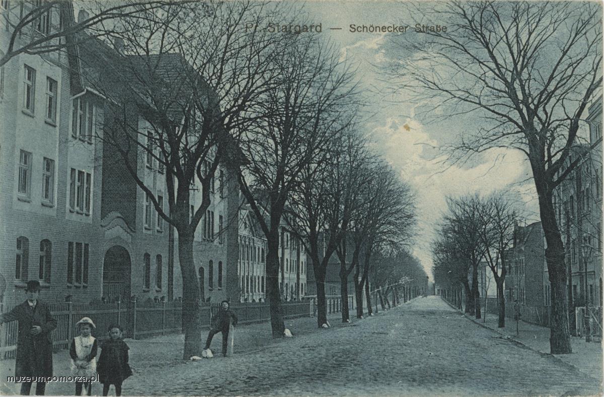 .Dawna ulica Skarszewska (Schonecker Strasse)- widok w kierunku wschodnim. W pierwszym budynku po lewj stronie jest siedziba policji, w następnym WKU.