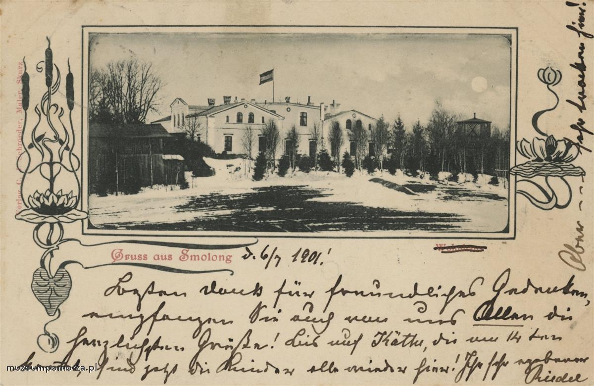 Smoląg- wieś kociewska w gminie Bobowo. Na pocztówce pałac dawna własność Kalksteinów. Powojnie siedziba PGR-u.