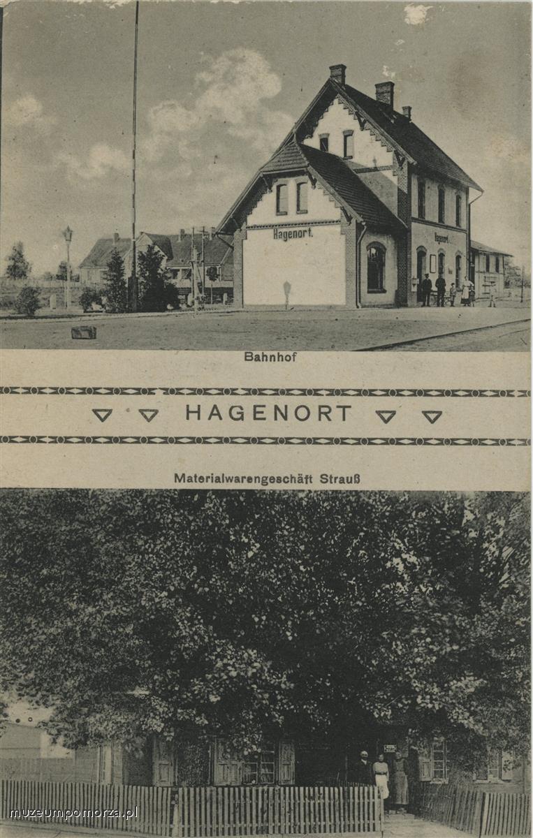 Pocztówka z Osiecznej (Hagenort), w powiecie starogardzkim, w gminie Osieczna na trasie zawieszonej linii kolejowej nr 218 (Szlachta – Myślice). przedstawiająca widok na budynek dworca kolejowego i dom z lipami.