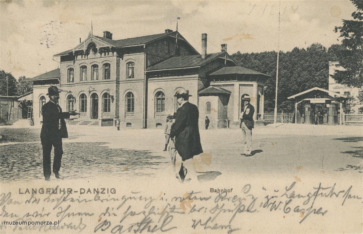 Ten budynek dworca kolejowego we Wrzeszczu nie istnieje. Zbudowano go w 1870 r. Został zniszczony w 1945 r. przez Armię Czerwoną. Po prawej stronie widać za torami zabudowania ulicy Białej. Obieg 1904 r.