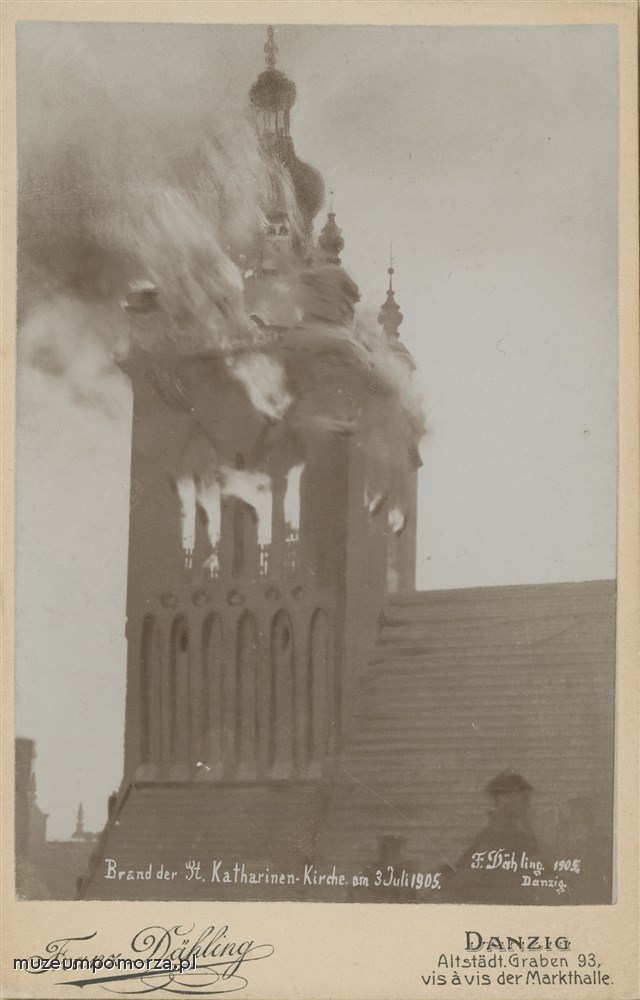 Pożar dachu i wieży kościoła św. Katarzyny spowodowany uderzeniem pioruna 3 VII 1905 r. W czasie pożaru spłonął carillon zamontowany na wieży w 1738 r.