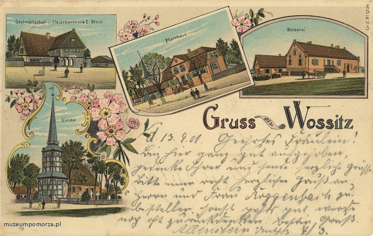 Na pocztówce przedstawiono: dom podcieniowy E. Blecha, mieszczący gospodę i sklep mięsny, Barokowy budynek dawnej plebani, mleczarnię oraz gotycki kościół z późniejszą rokokową wieżą o konstrukcji szachulcowej.