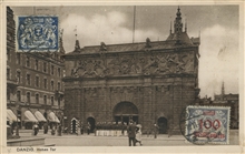 Spojrzenie na reprezentacyjny wjazd na Drogę Królewską od strony Targu Siennego. Na wprost Brama Wyżynna (Wysoka) i Wieża Więzienna z Katownią. Po lewej Danziger Hof, po prawej Bank von Danzig.