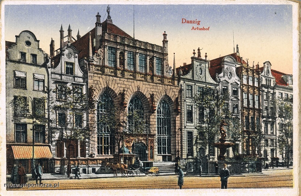 Pocztówka przedstawia widok na Dwór Artusa (Arturshof) z Długiego Targu. Po lewej stronie widoczna fontanna Neptuna.
