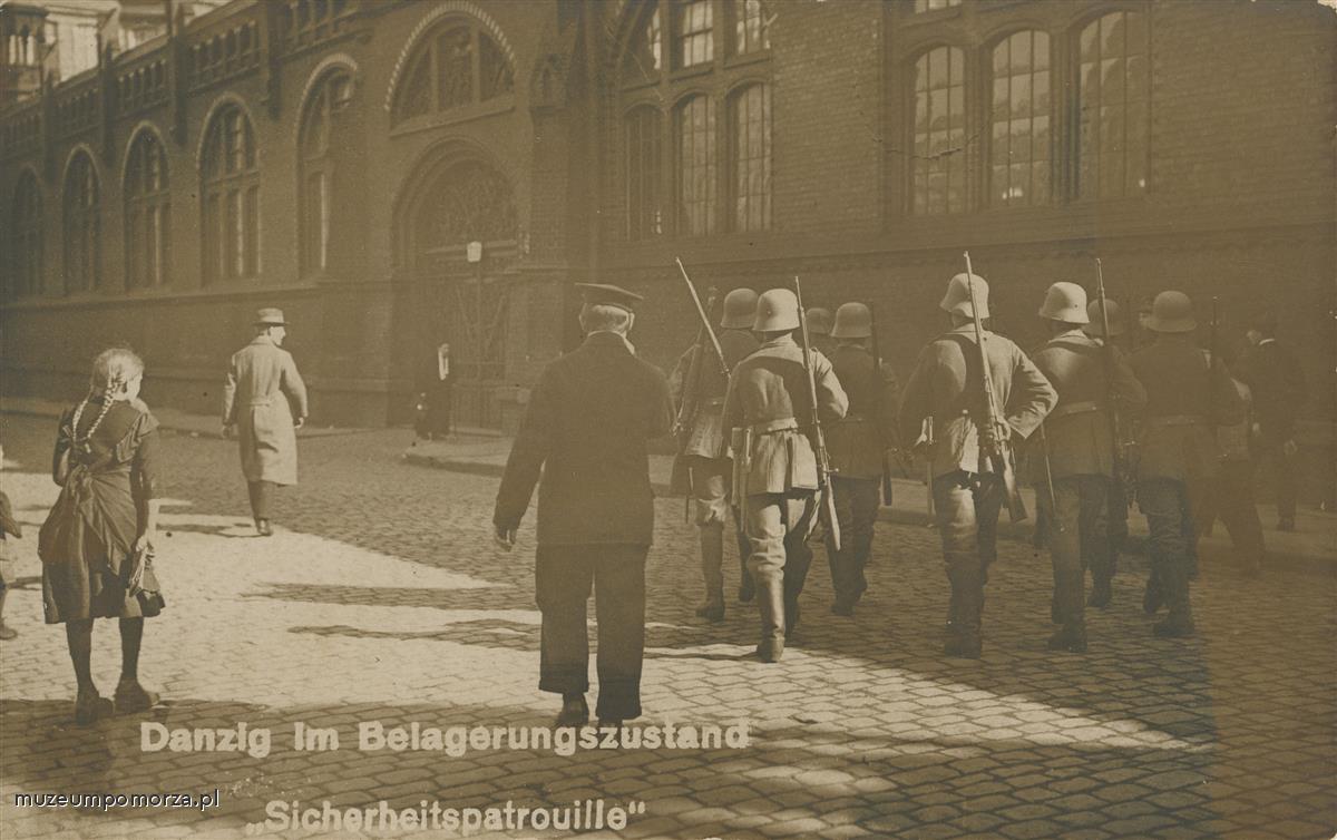 Gdańsk w "czasie oblężenia" (Belagerungszustand). Zdjęcie wykonano po zakończeniu I wojny światowej kiedy ważyły się losy Gdańska. Petrol niemieckich żołnierzy pilnuje porządku na ulicach miasta. Ostatni niemieccy żołnierze opuścili Gdańsk 8 lutego 1920 roku, stosując się do postanowień traktatu wersalskiego, a 15 listopada tego roku powstało Wolne Miasto Gdańsk,