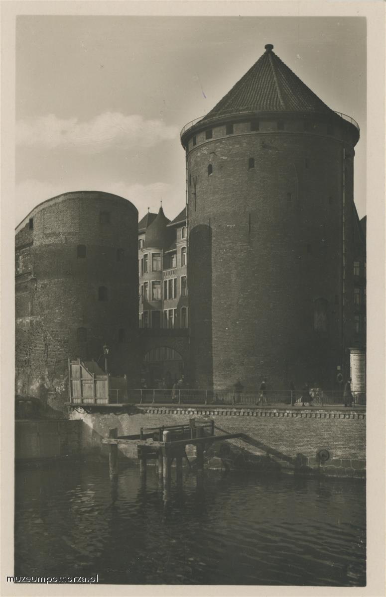 Widok na Bramę Stągiewną (Milchkannengassentor). Brama Stągiewna, wzniesiona zapewne w latach 1517-1519, została usytuowana w linii umocnień osłaniających od wschodu Wyspę Spichrzów. Dwubasztowy zespół Bramy Stągniewnej, bardzo nietypowy w swej bryle architektonicznej, budzi od dawna zainteresowanie badaczy. Przypuszcza się, że pierwotnie Brama miała stanowić układ trzech baszt flankujących dwa zawarte między nimi przejazdy,