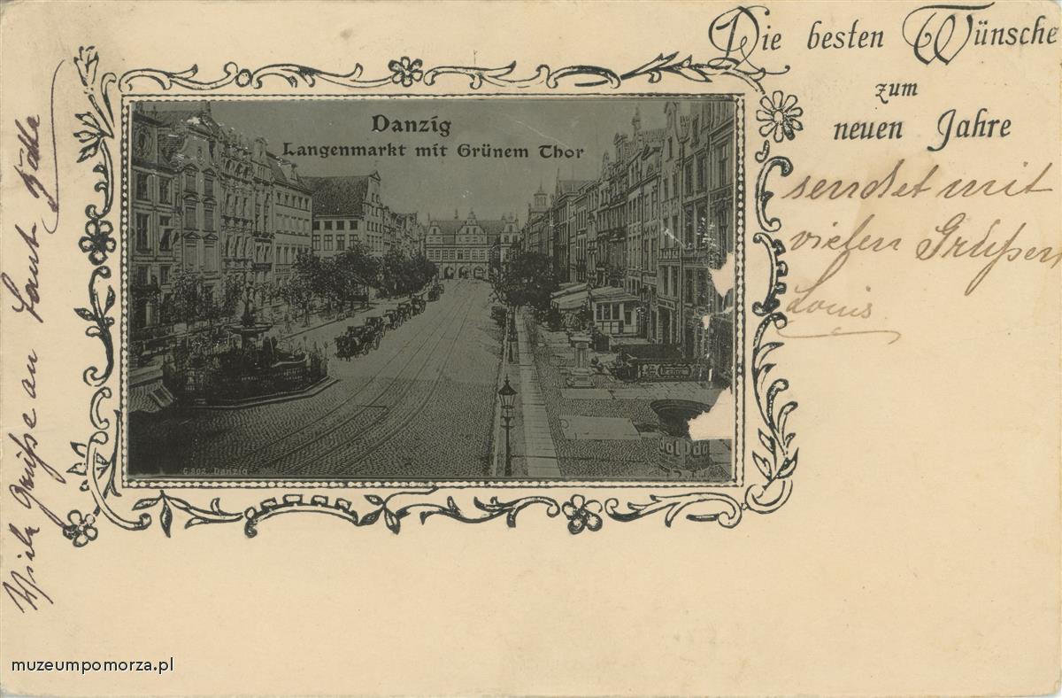 Pocztówka okolicznościowa z życzeniami noworocznymi. Na przyklejonej miniaturce widok na Długi Targ w stronę Zielonej Bramy. Obieg 1904 rok.