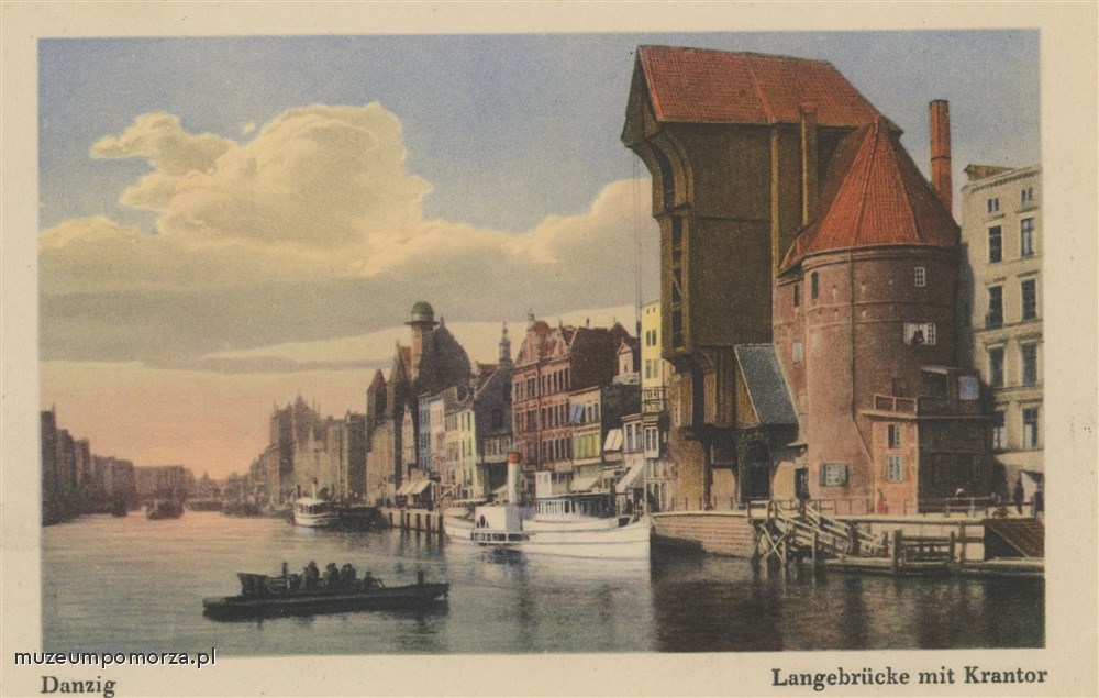 Widok na Żurawia i Długie Pobrzeże (Langebrucke). Widoczny jest też przepływający prom pasażerski. Prom przepływał Motławę z Wyspy Ołowianka do przystani przy Żurawiu.