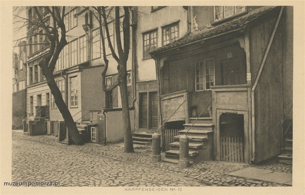 Ulica Karpia (Karpfenseigen) z domkami rybaków. Dziś w miejscu ulicy pozostał jedynie chodnik nad kanałem.