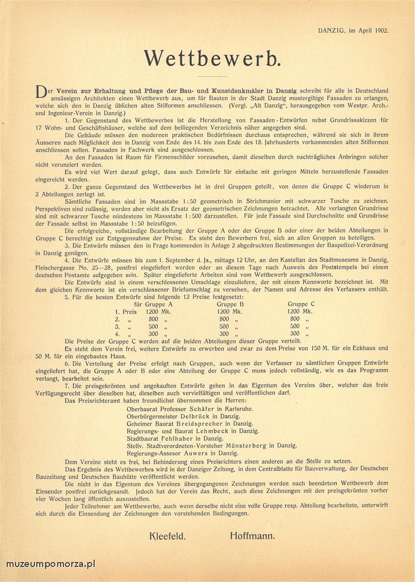 Strona katalogu wydanego przez Stowarzyszenie na rzecz Zachowania i Opieki nad Zabytkami Architektury i Sztuki w Gdańsku (Verein zur Erhaltung und Pflege der Bau- und Kunstdenkmäler in Danzig). Katalog przedstawia projekty gdańskich fasad zgłoszone na konkurs w 1902 r.