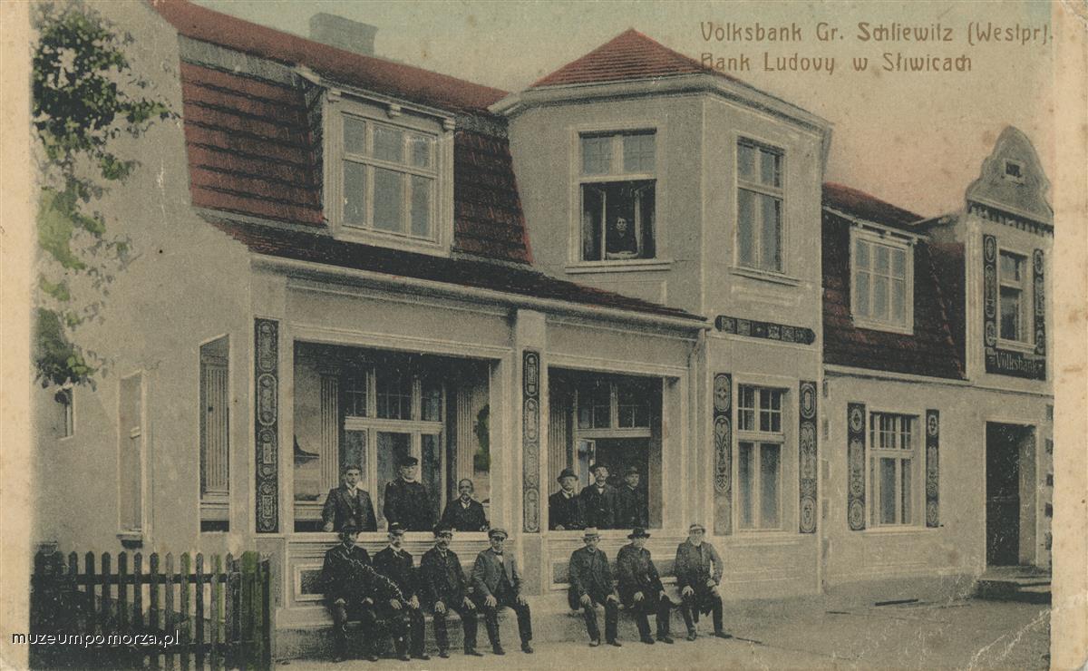 Na pocztówce widzimy budynek Banku Ludowego, który powstał w 1873 roku z inicjatywy Teofila Krzeszowskiego. Instytucja ta (był to bank spółdzielczy, gdzie akcjonariuszami byli w większości gospodarze-Polacy) odegrała olbrzymią rolę w obronie tych terenów przed germanizacją.