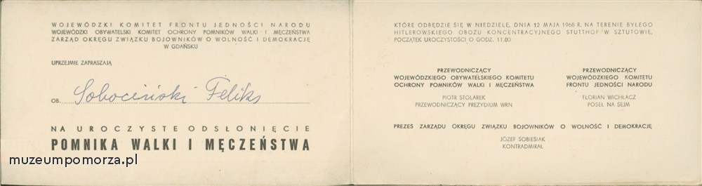 Zaproszenie dla Feliksa Sobocińskiego na odsłonięcie Pomnika Walki i Męczeństwa w Sztutowie. Zapraszającym jest Wojewódzki Komitet Frontu Jedności narodu, Wojewódzki Obywatelski Komitet Ochrony Pomników Walki i Męczeństwa , Zarząd Okręgu Związku Bojowników o Wolność i Demokrację w Gdańsku. Odsłonięcie odbyło się 12 maja 1968 r. Pomnik składa się z dwóch części. Pionowa symbolizuje walkę, a pozioma męczeństwo.